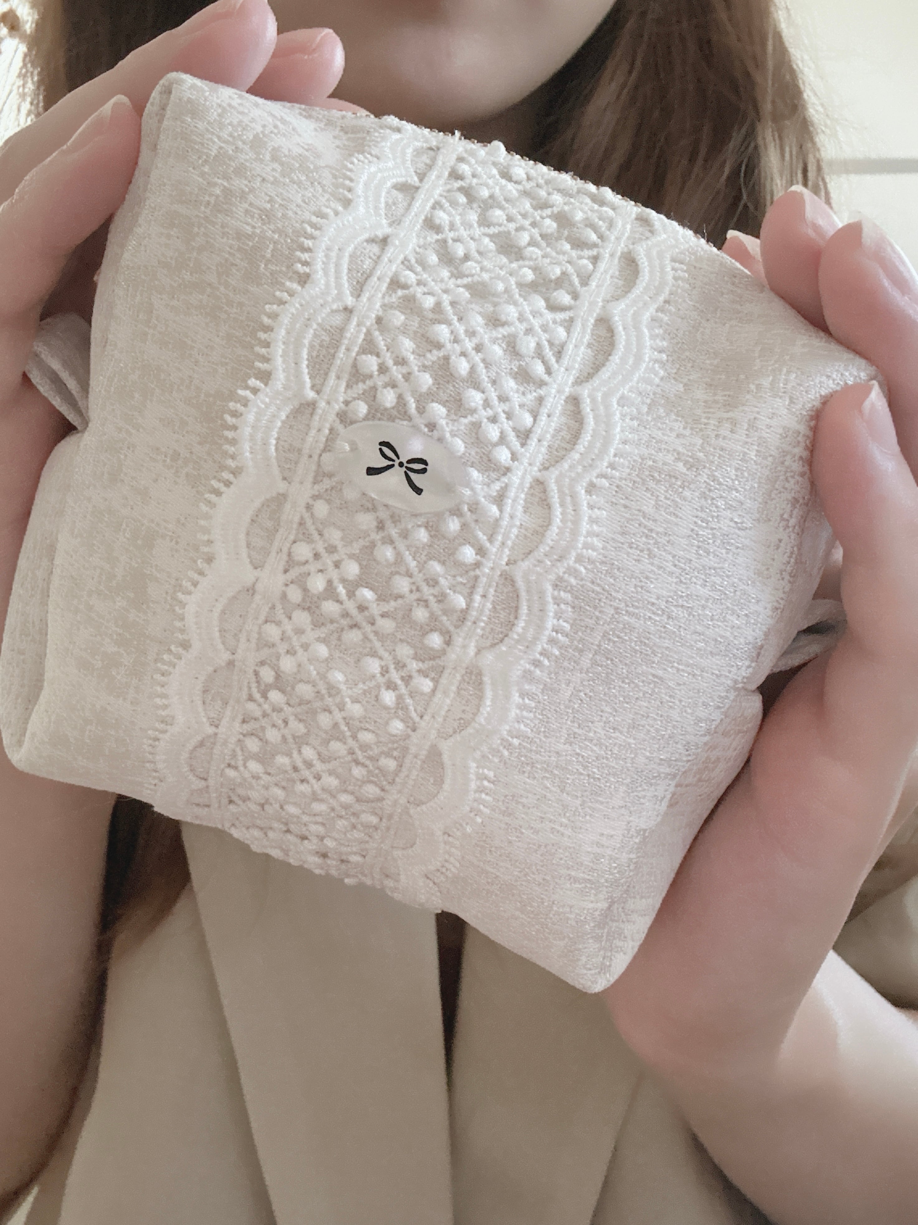 ツヤのある生地にレースとリボンのパーツを付けて仕上げました♡