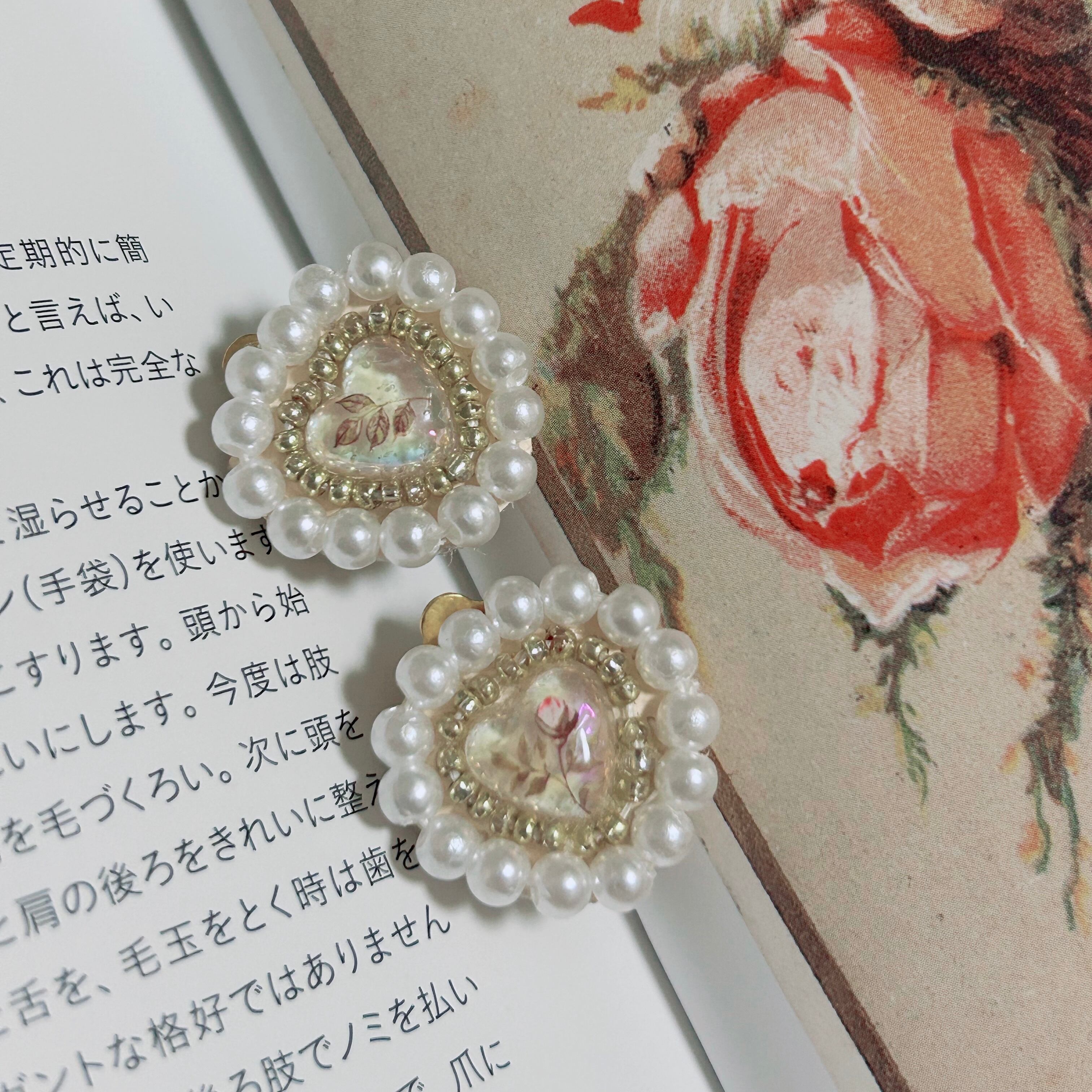 ビーズの刺繍を施したハートのイヤリングです♡